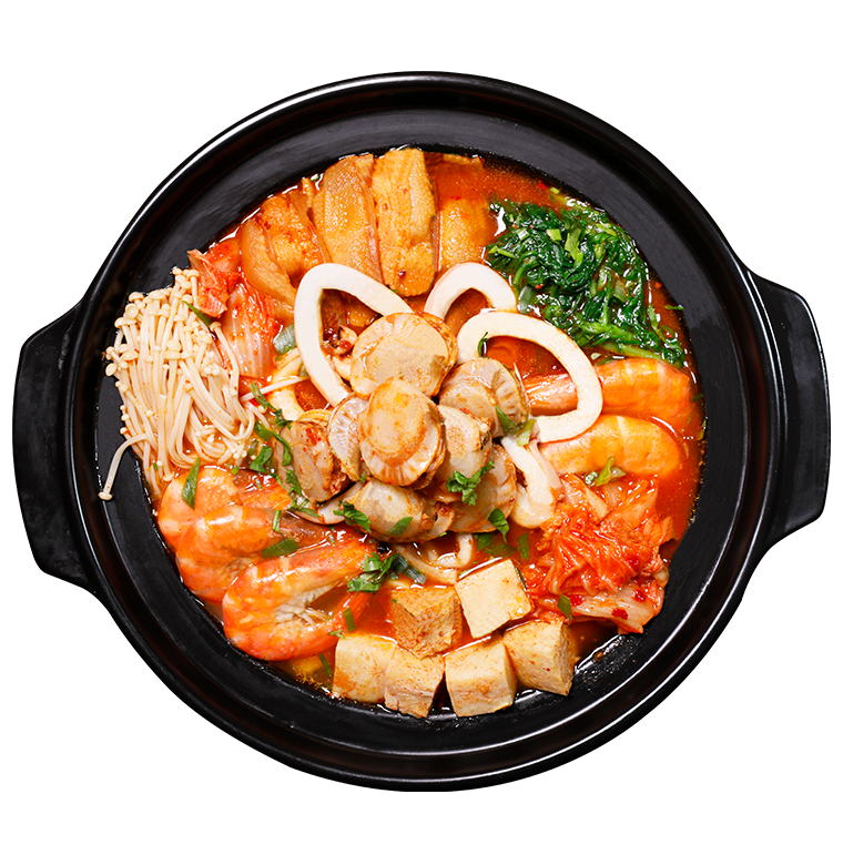 五花肉、辣白菜、年糕、魷魚、蝦夷貝、白蝦、娃娃菜、洋蔥、豆腐、金針菇、香菇、蟹味菇